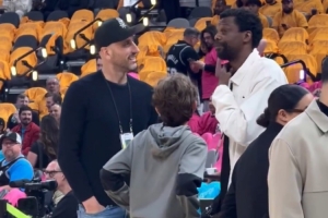 个子挺高!文班亚马老爸和球队名宿吉诺比利场边畅聊